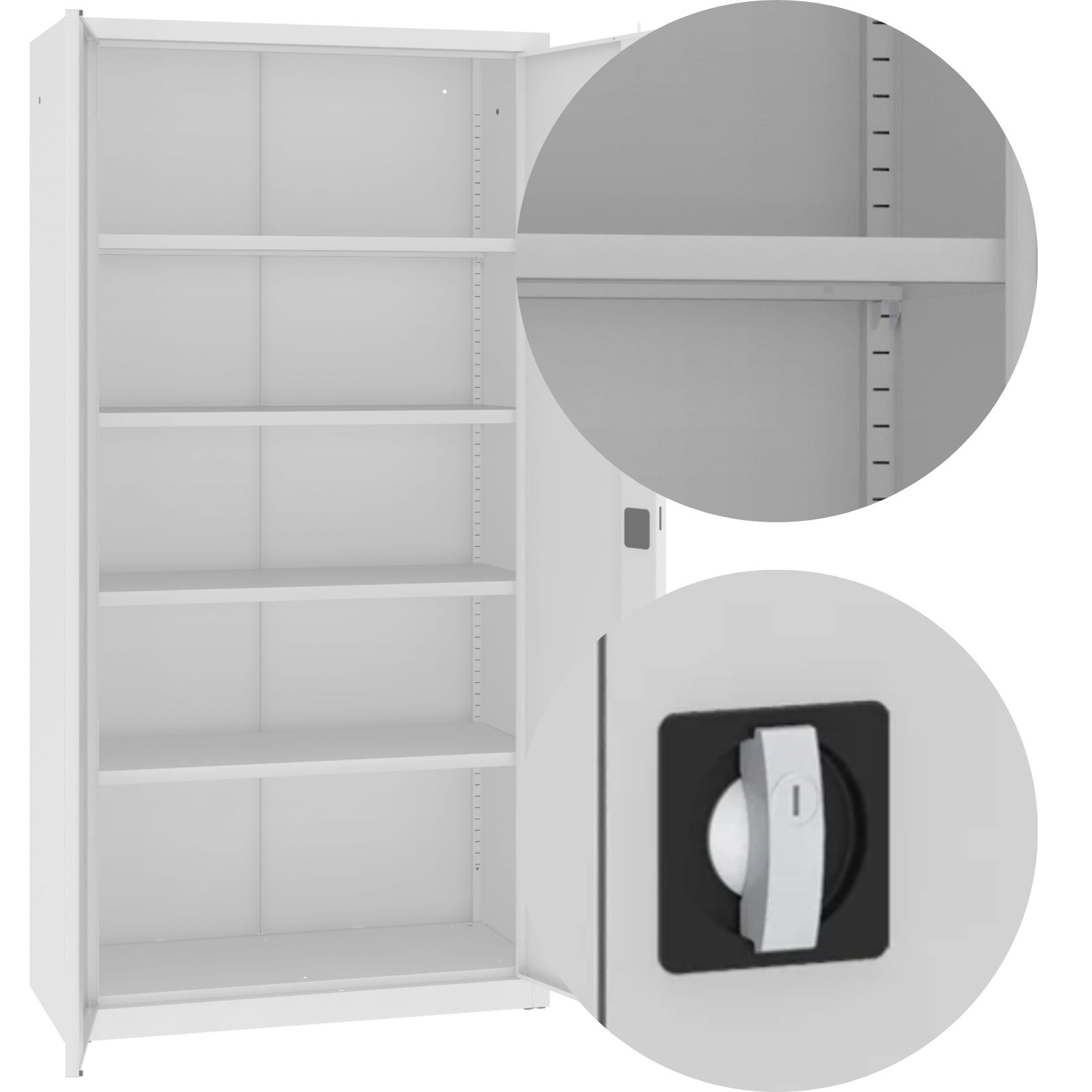 Wewnątrz szafy aktowej znajdują się cztery mocne, pojemne półki, na których przechowywać można dokumenty, segregatory, projekty, jak również wszelkie akcesoria biurowe. Położenie każdej z nich można w wygodny sposób modyfikować, przestawiając ją co 2,5 cm w górę lub w dół. Maksymalne obciążenie każdej z półek to aż 60 kilogramów.
