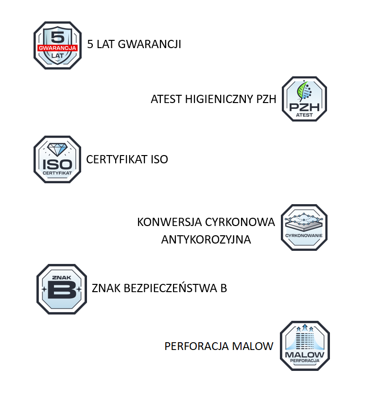 Jakość wykonania danej szafy metalowej potwierdzają otrzymane certyfikaty i atesty. Ponadto oferujemy pięcioletnią gwarancję!
