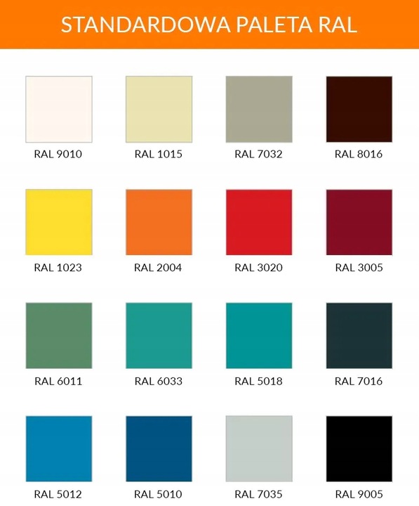 *Niniejsza tabela ma jedynie na celu przybliżone przedstawienie kolorów. Dokładniejsze odwzorowanie barw zawiera pełna paleta kolorów RAL. Zastrzegamy sobie możliwość występowania nieznacznych odstępstw od podanych kolorów, co nie uprawnia do zgłaszania reklamacji.