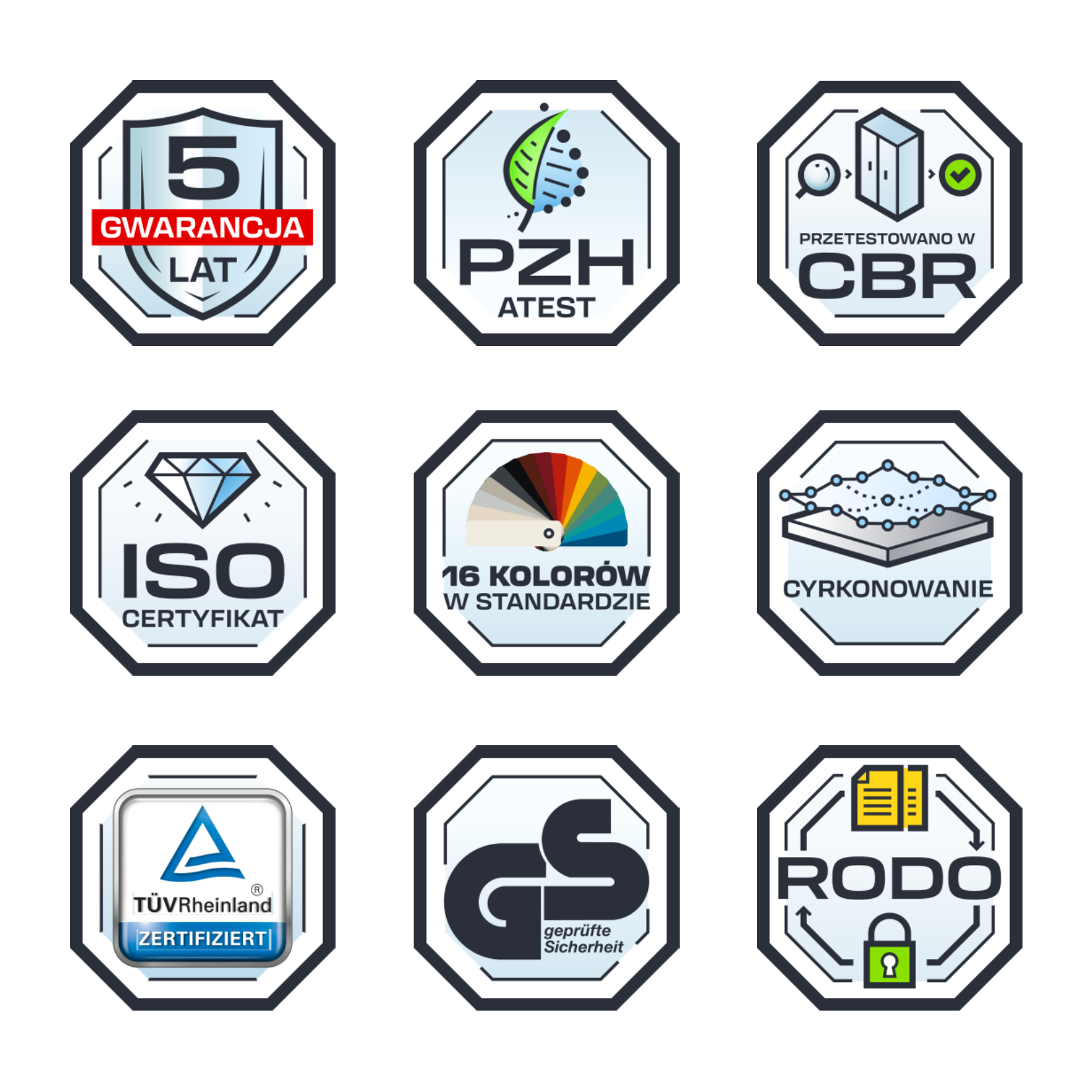 Jakość wykonania danej szafy metalowej potwierdzają otrzymane certyfikaty i atesty. Ponadto oferujemy pięcioletnią gwarancję!