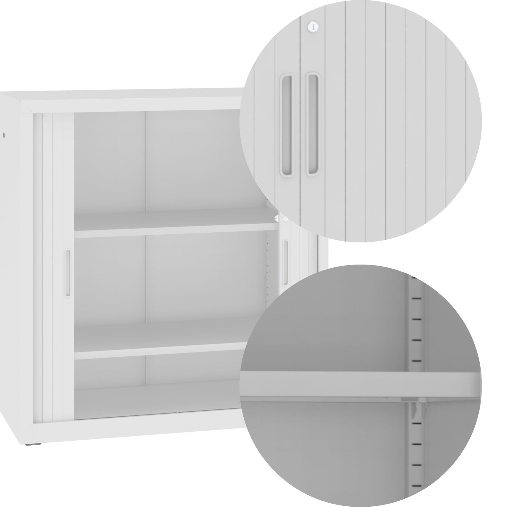 Warto zwrócić także uwagę na materiały, których użyto do wykonania mebla. To wysokiej klasy blacha stalowa oraz tworzywo PCV. Dzięki ich połączeniu szafa charakteryzuje się wyjątkową trwałością i odpornością, jak również wygodą użytkowania. Wykonane z tworzywa sztucznego drzwi przesuwne umożliwiają ustawienie szafy w niemal każdym miejscu, nawet w wyjątkowo niewielkim i ciasnym biurze. Uchwyt drzwiowy wyposażony został w zamek blokujący drzwi w 2 punkatch- góra i doł.