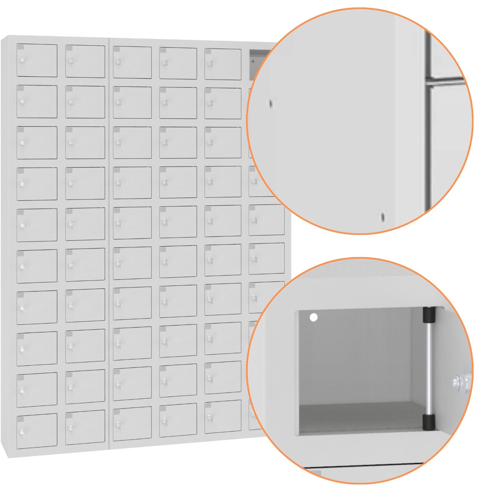 Szafka na telefony komórkowe i smartphone WSS 60 przegród klucz to niezwykle praktyczny mebel, który znajduje zastosowanie we wszystkich tych miejscach, do których nie można wnosić smartfonów. Pozwala on na w pełni bezpieczne ich przechowywanie. Depozytor na telefony komórkowe z powodzeniem schować można także portfel lub klucze. Szafka skytkowa składa się z 60 skrytek, z których każda jest zamykana na osobny zamek ryglujący. Został on wykonany z wysokiej jakości blachy pomalowanej metodą proszkową.